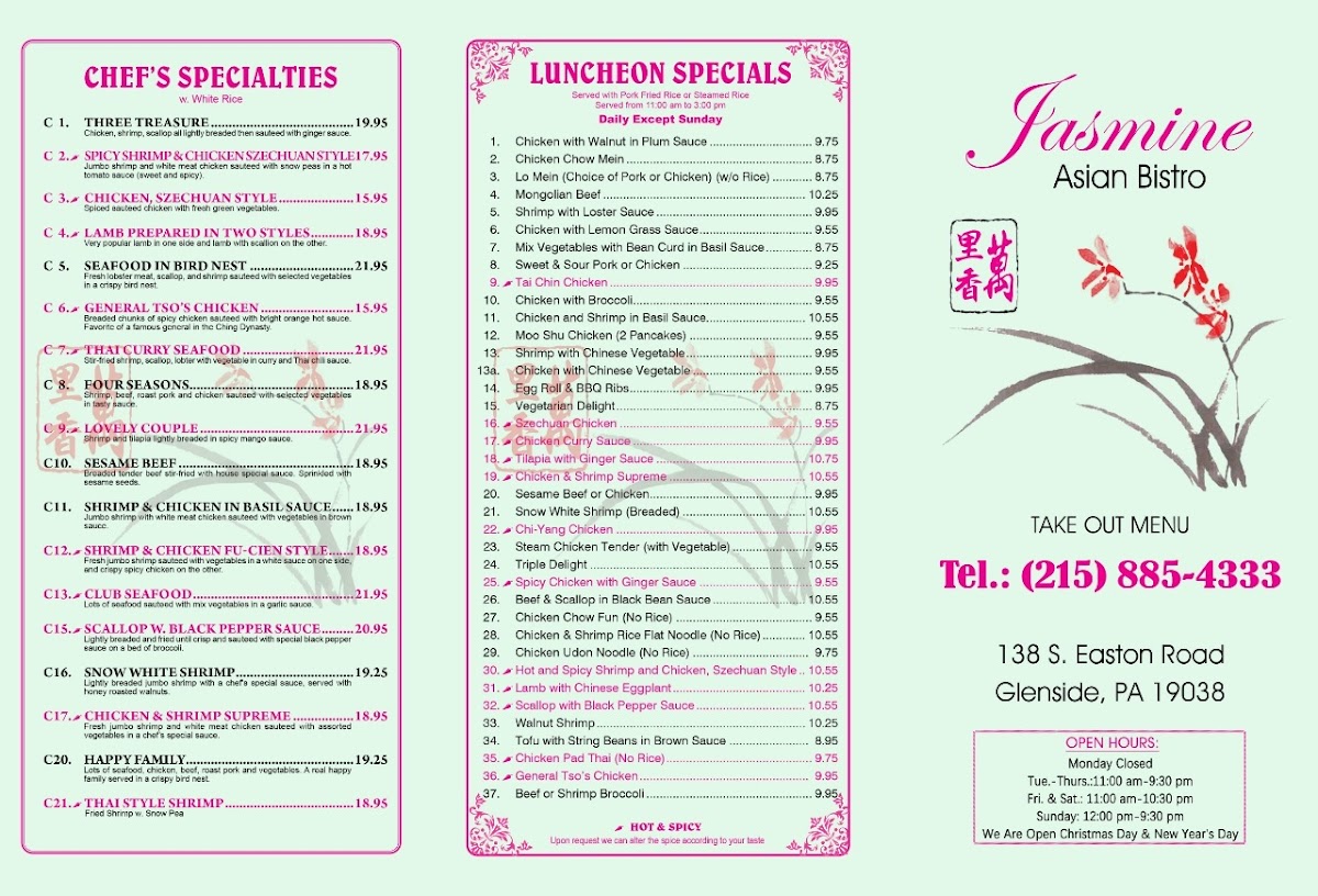 Welcome to Jasmine Asian Bistro, a hidden gem located in Glenside, PA, offering an exquisite menu that beautifully captures the essence of Chinese cuisine. With dishes thoughtfully curated to cater to various tastes, the bistro is renowned for its delectable fried rice options and a wide array of beef and seafood selections. Highlights include the Beef with Broccoli and Shrimp with Cashew Nuts, both available in generous portions.
